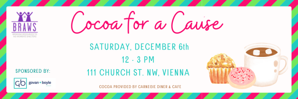 BRAWS 4th Annual Cocoa for a Cause is returning on Saturday, December 6th. Located in front of Evelyn Rose (111 Church St NW, Vienna), this event will have a plethora of savory and sweet baked goods, as well as delicious hot cocoa for purchase. Your purchase helps provide essential menstrual products, bras and underwear to local girls and women in our community.