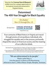 Explore the traveling exhibition "Determined" on loan from the Virginia Museum of History and Culture (VHMC) from Nov 15 through Dec 21. Determined: The 400-Year Struggle for Black Equality traces four centuries of Black history in Virginia through stories of extraordinary individuals who struggled for equality and, in the process, profoundly shaped the nature of American society and the meaning of our collective ideals.