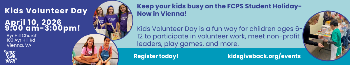 Fairfax County Public Schools are closed on April 10, and we are offering another one of our popular Kids Volunteer Days–this time in Vienna! Children ages 6-12 will participate in volunteer service projects, meet nonprofit leaders, enjoy games, and more. Volunteer projects will be announced closer to the date, but may include: