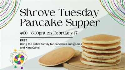 Join us for Vienna Presbyterian Church’s annual Shrove Tuesday Pancake Supper on February 17 from 4:00 to 6:30 PM! This free, family-friendly event is open to all ages. Enjoy delicious pancakes, sausage, games, King Cake, and more!