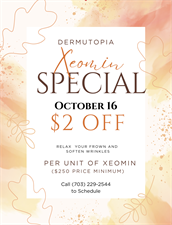 Fall is the perfect time for a refresh! On Thursday, October 16th we’re offering $2 OFF per unit of Xeomin ($250 price minimum). Appointment needed. Call (703) 229-2544 to schedule.